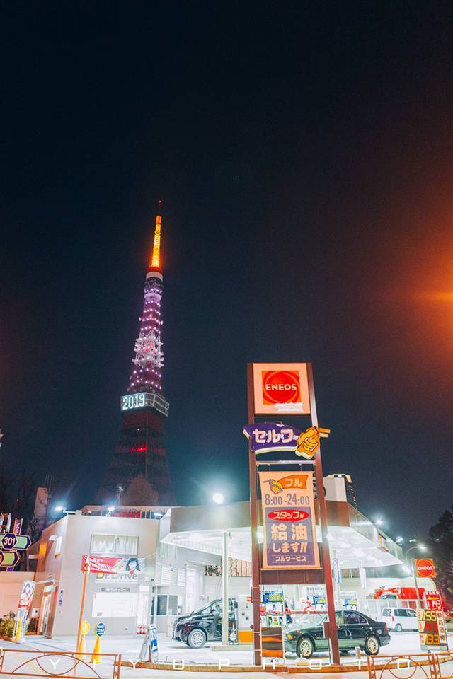 出了地铁赤羽桥站就可以看到看到下图的加油站,然后就可以一直随着人流向着 东京 塔的方向走去,拍这几张正是 东京 塔熄灯之后慢慢亮起的时刻,感觉一切都很魔幻。