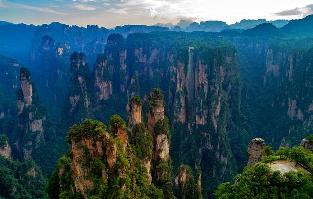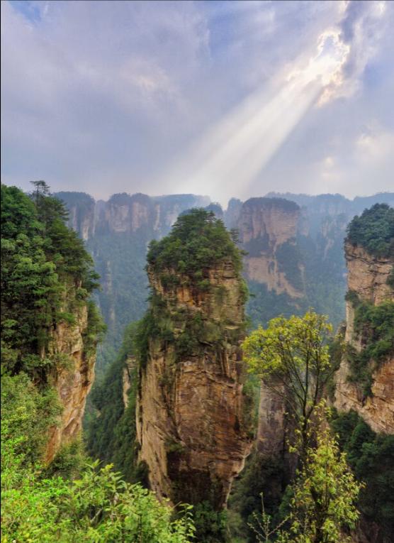 作为《阿凡达》资深影迷,自然是不会错过哈利路亚山。在游客中心吃完午饭,我们迫不及待的朝着目的地进发。片中美轮美奂的“哈利路亚山”让人惊叹,犹如梦中仙境,飘浮在空中的巨石如同海上的冰山在缓慢的移动。它们的边缘都是陡峭的岩壁,不过岩石上长满了植物,甚至还有瀑布流下。当地人管它叫“乾坤柱”,又叫做“南天一柱”, “乾坤柱”为张家界“三千奇峰”中的一座,位于袁家界景区南端,海拔高度1074米,垂直高度约150米,顶部植被郁郁葱葱,峰体造型奇特,垂直节理切割明显,仿若刀劈斧削般巍巍屹立于张家界,有顶天立。