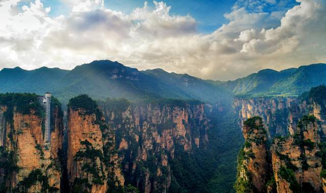 一开始刚上去的时候还很期待它接下来的反应,结果后来当我反应过来的时候已经是半山腰了,不过还好我也看到了对面矗立的一座座山峰和整个武陵源景区最精彩的景色,很是壮观。我想我看到的矗立的一座座山峰就是神兵聚会了。大大小小的色块组合仿佛神兵的防护服,于是千山万壑间便如掩藏着无可数计的伏兵。
