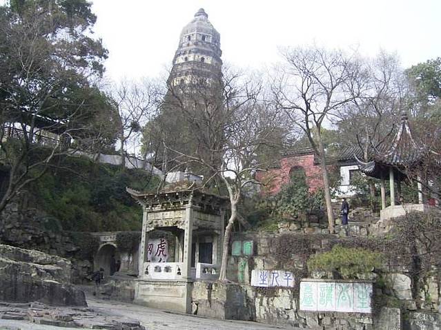 AAAAA景区 虎丘位于 苏州 城 西北 郊,距城区中心五公里,为 苏州 西山之余脉,因周边地形脱离西山主体,成为独立的小山。 相传春秋时吴王夫差葬其祖父阖闾于此,葬后三日有白虎踞其上,故名虎丘。一说“丘如蹲虎,以形名”。 山高34.3米,古树参天,山小景多,千年虎丘塔矗立山巅。《吴地记》载:“虎丘山绝岩纵壑,茂林深篁,为江左丘壑之表。”向有“吴中第一名胜”之誉。