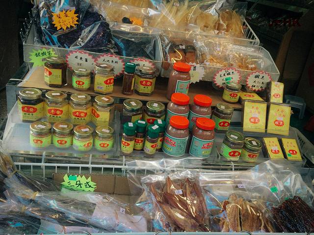 岛上还有一些卖海鲜产品的,在大澳,美味的虾酱都是整个香港人都要来采购的食品,门店的老板说,每逢周六日,他们店里排队买虾酱的人都可以排队到对面10米的店铺。
