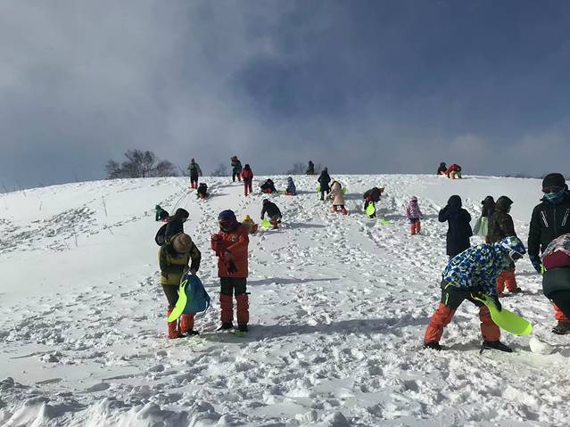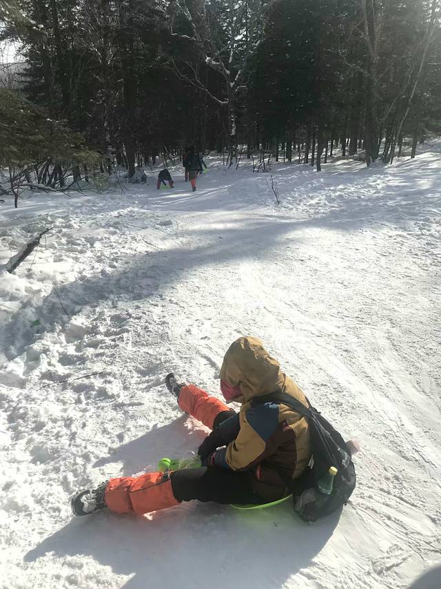 开始的五公里是一段平缓的路,有马拉爬犁作为交通工具,之后的开始徒步10公里,中午到山顶有休息的地方有泡面。