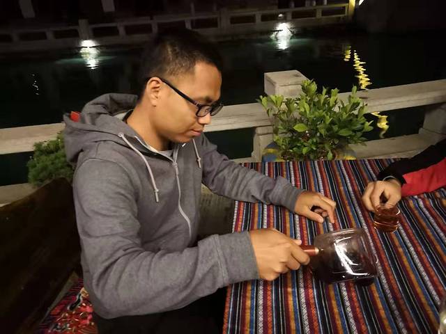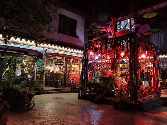 从博物馆出来前往楚雄彝人古镇,到达古镇的时候天已经快要黑了,到了之后就找地方吃饭,接着就去了古镇里面闲逛。说实话古镇比我想象的要大得多、热闹得多,和所有古镇一样,装修风格、店铺、、酒吧、卖的东西都差不多。当天的运气比较好,看到了当地出名的民族乐团表演,彝族歌曲也别有一番风味,广场上人山人海,热闹非凡。街上随处可以看到马车、驴车,让人心生怜爱。最后我们找了一个比较安静的小酒馆喝茶,小酒馆在主街道的旁边,一边临街、一边临河,装修优雅,门口是一男一女在表演,门口蹲着三只小狗崽,特别招人喜欢,在这样的环境下边喝茶边聊天,哎呀,那叫一个美。