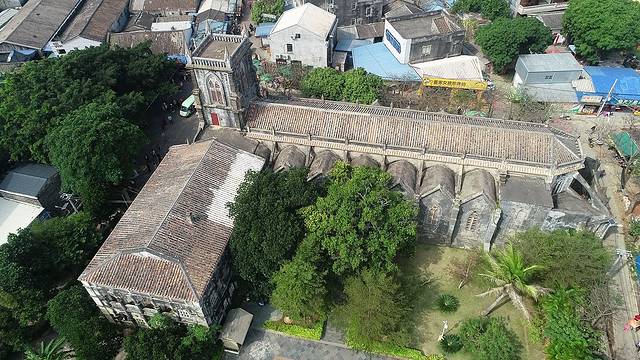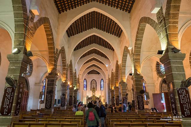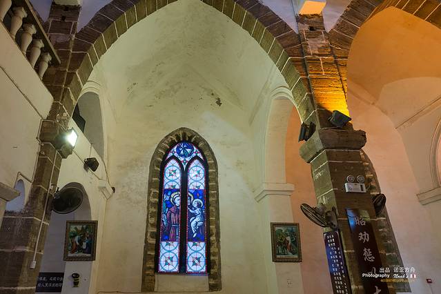 高大雄伟的天主堂,在四周低矮民居的衬托下,显得规模庞大,颇有气势。正门顶端是钟楼,高耸着罗马式的尖塔,有着随时“向天一击”的动势,造成一种“天国神秘”的幻觉,堪称别具一格。