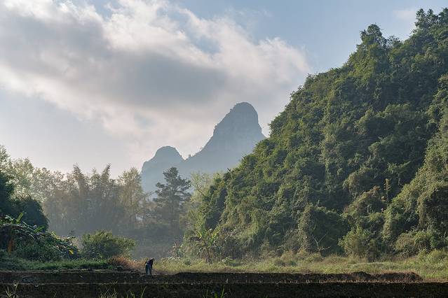 9点40分,接近德天瀑布游客中心时遇上堵车,游客还是挺多的,索性拿出相机,摇下车窗拍下这张老农耕作的画面。