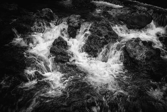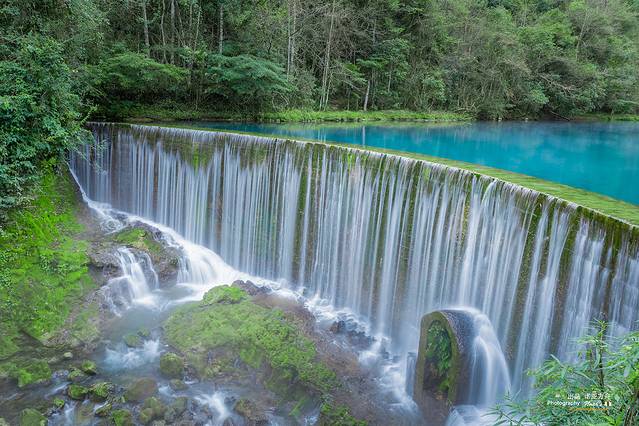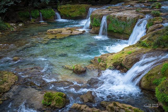 层层叠叠的瀑布,淙淙哗哗倾泻而下,或倾珠撒玉,推雪拥云,或如匹练飘逸,似银河泻地,形态各异,气象万千。千姿百态的瀑布跌水竞领风骚,争奇斗妍,构成风情万种的动态水景。