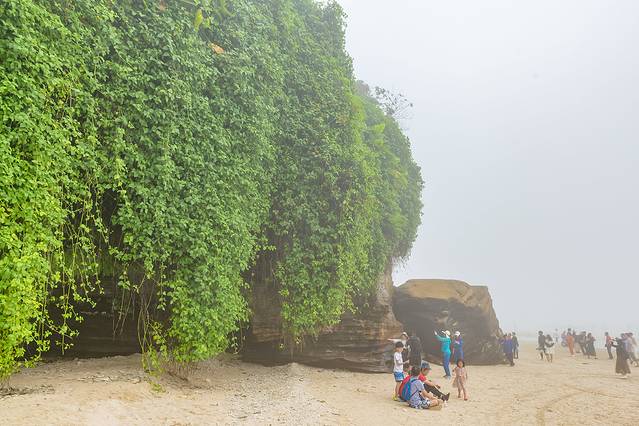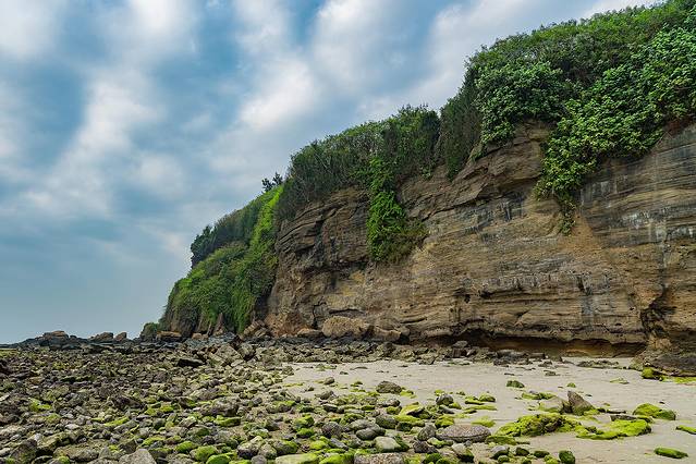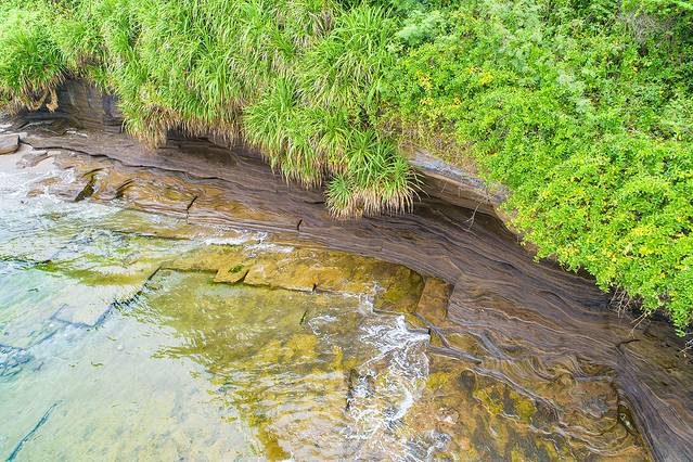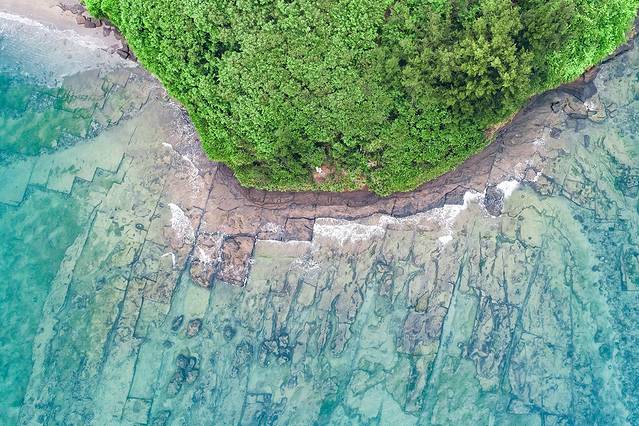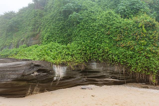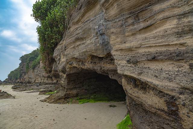 滴水丹屏位于涠洲岛滴水村南岸边,原名滴水岩。绝壁上部绿树成荫,壁上层 间裂隙常有水溢出,一点点往下滴,如朱帘垂挂。