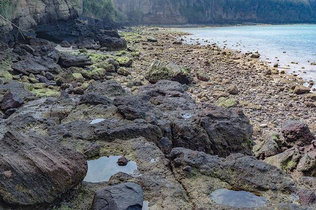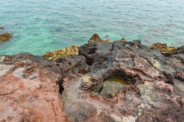 大片大片的火山熔岩裸露出来,特别的宽阔。许多地方虽然海水退了,但还是留下了一洼一洼的水。