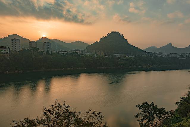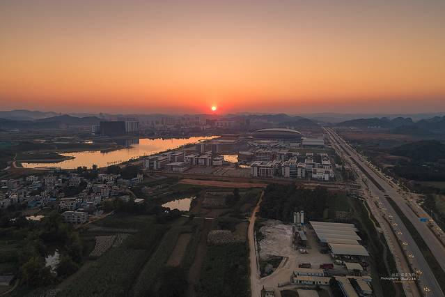 航拍夕阳下的崇左市。