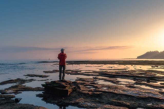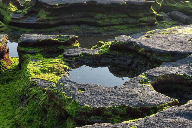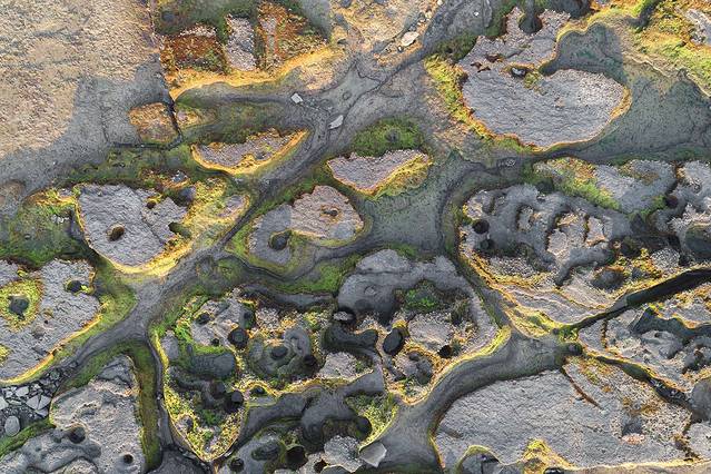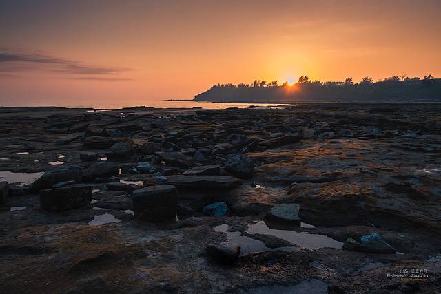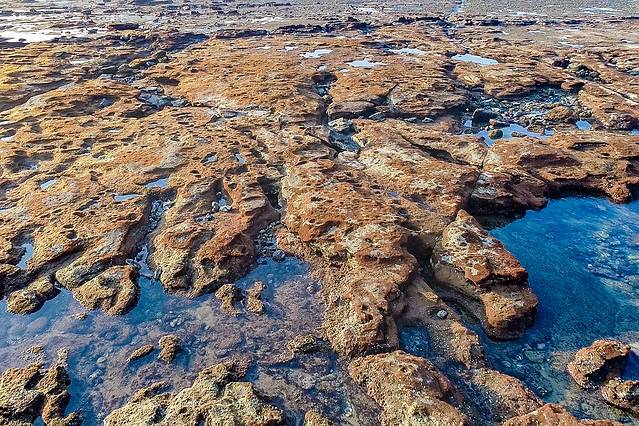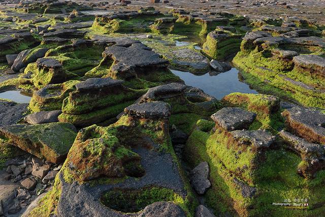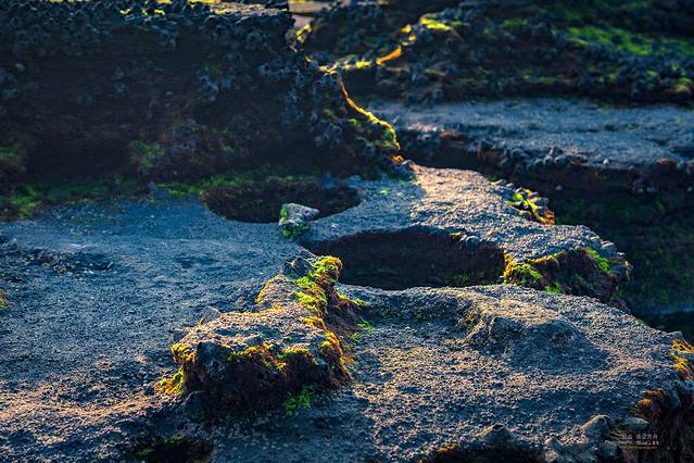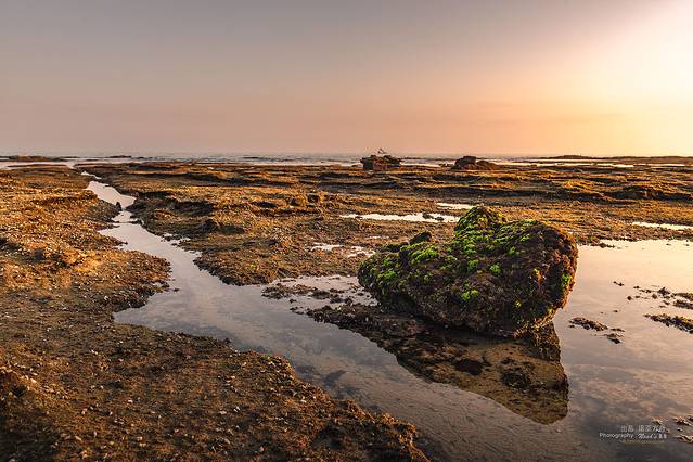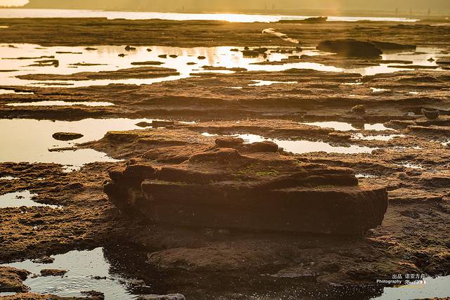 在夕阳的映射下,一洼一洼的水在视线中也变成了缤纷色彩,和裸露的岩石搭配在一起,非常迷人。