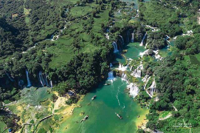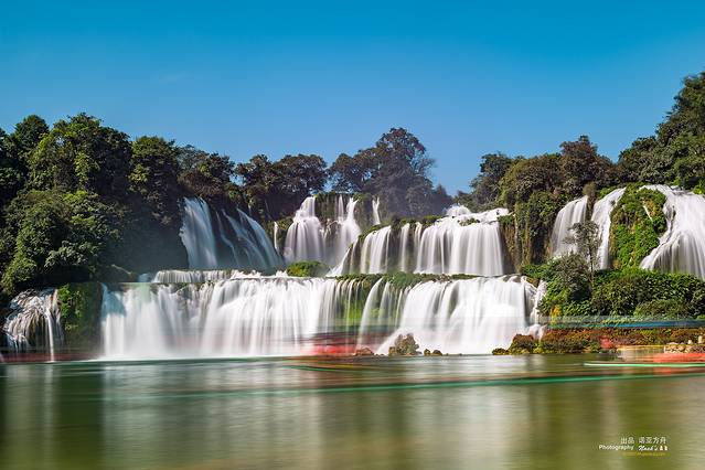 河的左边是越南,流淌的瀑布叫板约瀑布,河的正前方是中国境内的瀑布。两个瀑布连为一体,就像一对亲密的姐妹。