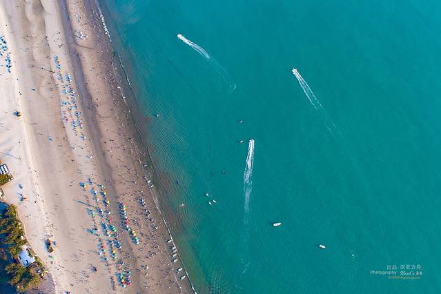 沙滩上的太阳伞和水上摩托艇划出的线条构成一幅令人向往的度假地。