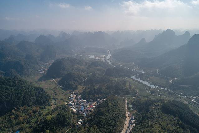 到达游客中心停车场已是11时许,停好车后第一件事将无人机升至天空,看看能否从远处看到德天瀑布,搜索了一圈,群峰之间没能看到,也没敢将无人机飞得更远。