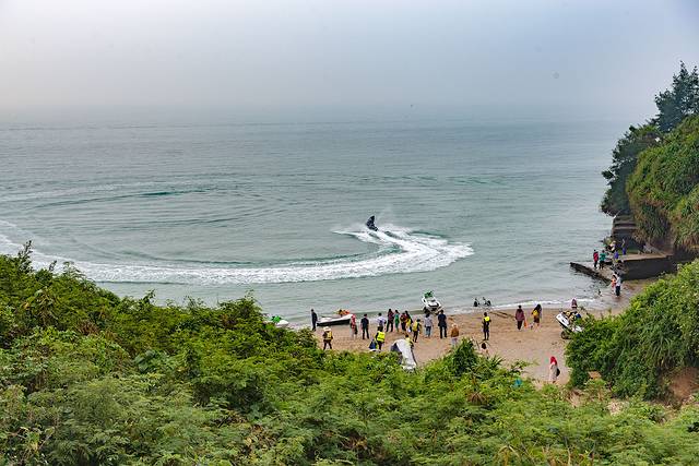 现在是退潮时刻,海滩上,家长带着小孩或开沙滩摩托,或赶海,玩得不亦乐乎。