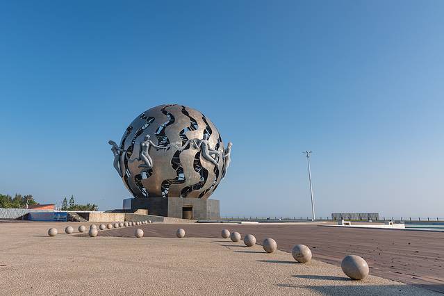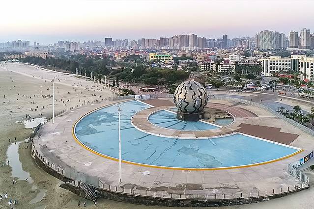 海滩公园里有亚洲最大的音乐雕塑喷泉,它就是号称亚洲第一钢塑的“潮”, 巨大的钢球用不锈钢镂空制成,以象征一颗大明珠的球体和七位裸体少女护卫球为主体,以大海、潮水为背景,使传统的人文精神与现代雕塑建筑艺术融为一体,形成完美和谐的统一体,这个雕塑也成为银滩的标志性建筑。