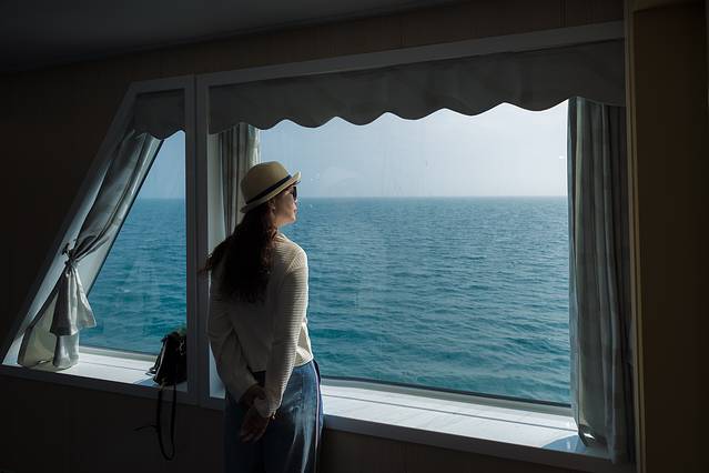 LP站在游船上看着窗外,海是那么的蓝。