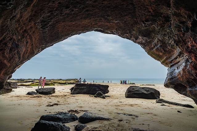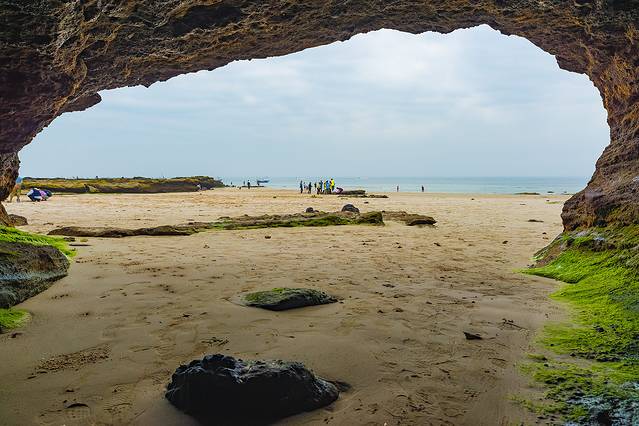 钻进山体的海蚀洞里向外看,别有洞天。