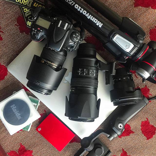 携带的摄影器材:尼康D800+尼康70-200镜头+尼康24-70镜头+蔡司DistagonT*21mmF2.8ZF.2镜头、大疆OSMO、大疆精灵Phantom4 Pro V2.0、iPhone6、iPad,附件有三脚架、闪光灯、减光镜、CF卡、SD卡、快门线等。其他:笔记本、移动硬盘、接线板、充电宝、头灯、手电筒。