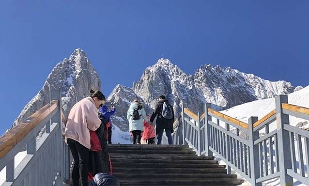 索道会在一个大观景台处停下来,此时已经站在4500多米高的山头儿了,觉得有一点点不舒服,说不出什么感觉,应该就是高原反应。几个孩子和几个孩子和妈妈们往上走了一截就放弃了,决定原地休息等我们下来,我们继续往上走,比平时爬山要累的多,越往上吸氧气瓶越频繁