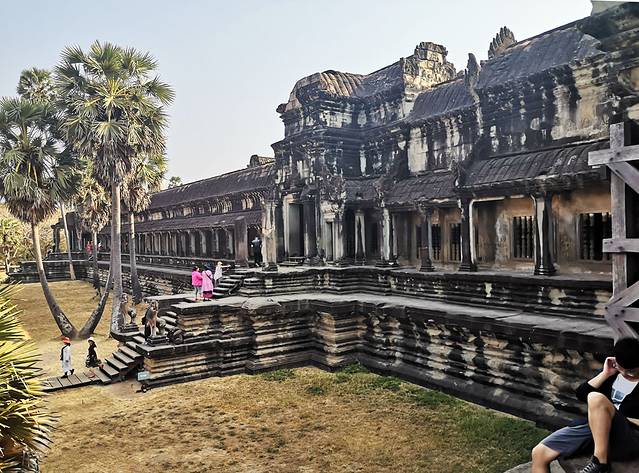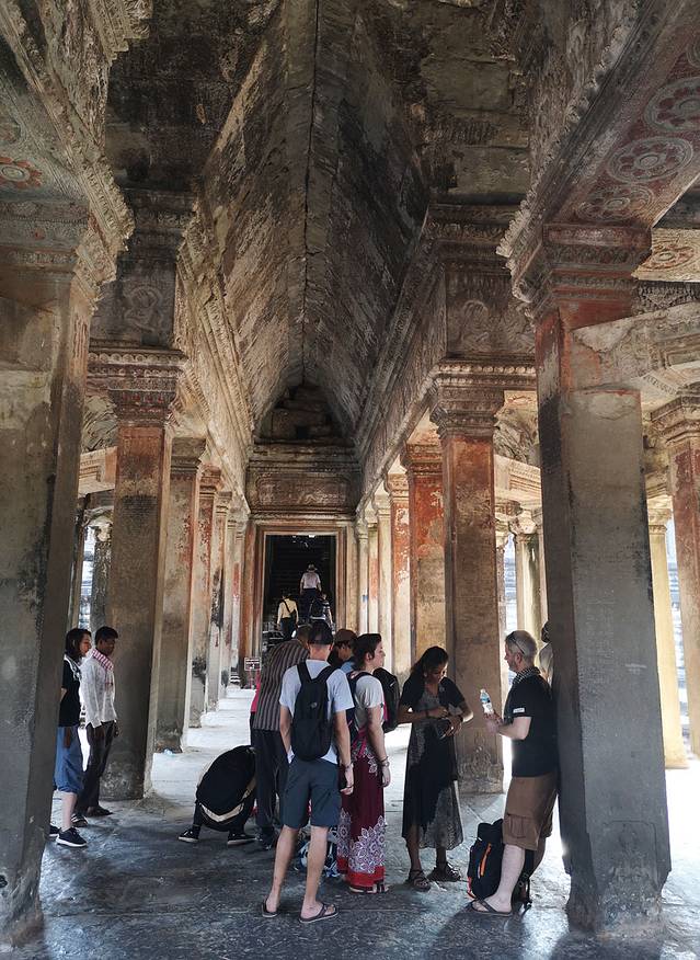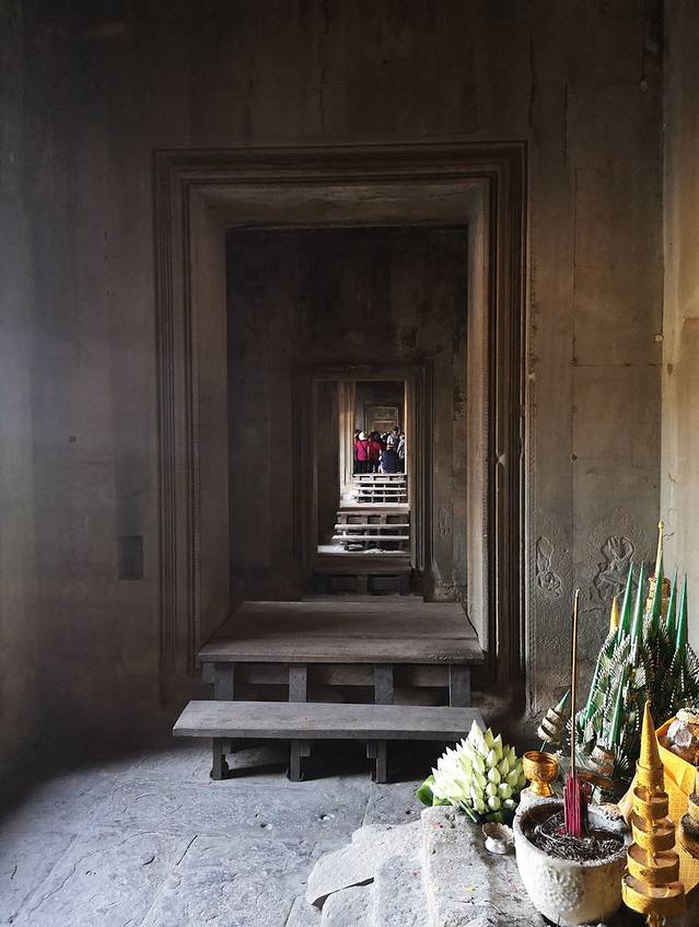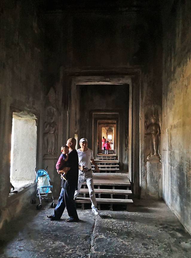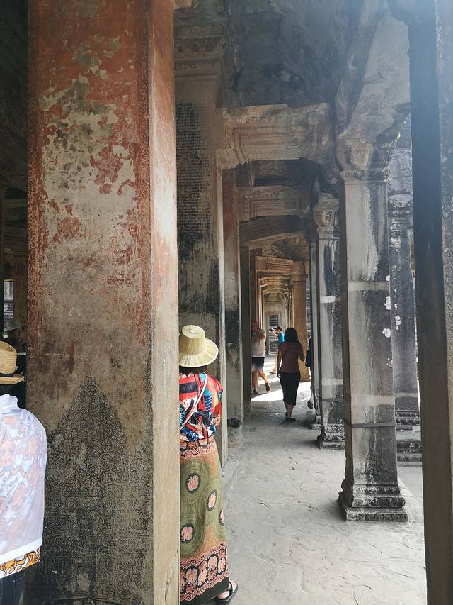 小吴哥由大到小共有三层。进入第一层回廊西门,踏入一个名为“千佛阁”的田字阁,四周环绕回廊。