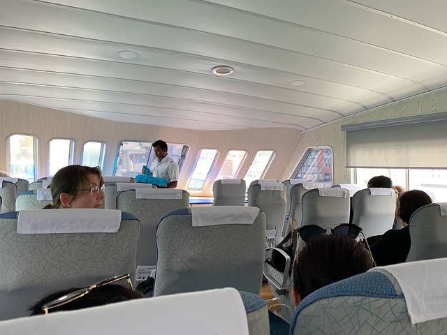 小编前年去了泰国,去斯米兰岛时也是坐的快艇一个多小时,是穿着救生衣围一圈的那种,本以为这次也是,没想到还挺豪华~上船服务超好,给发一块冰毛巾(味道奇异的冰凉的香味)还给发冰水。小黑讲解一下时间和船上卫生间位置(大概怕有人吐…哈哈哈)