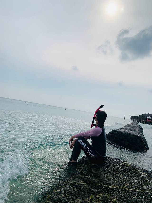 这里海边设的有防浪堤,不太会水的可以在里面游,会水的可以穿过去游,堤里面鱼很少还都是死珊瑚
