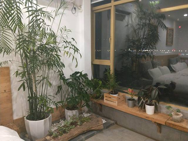 房间一角摆放着高大的竹子、肉肉花、龟背竹等绿植,使人视觉感觉很舒服。
