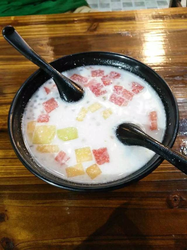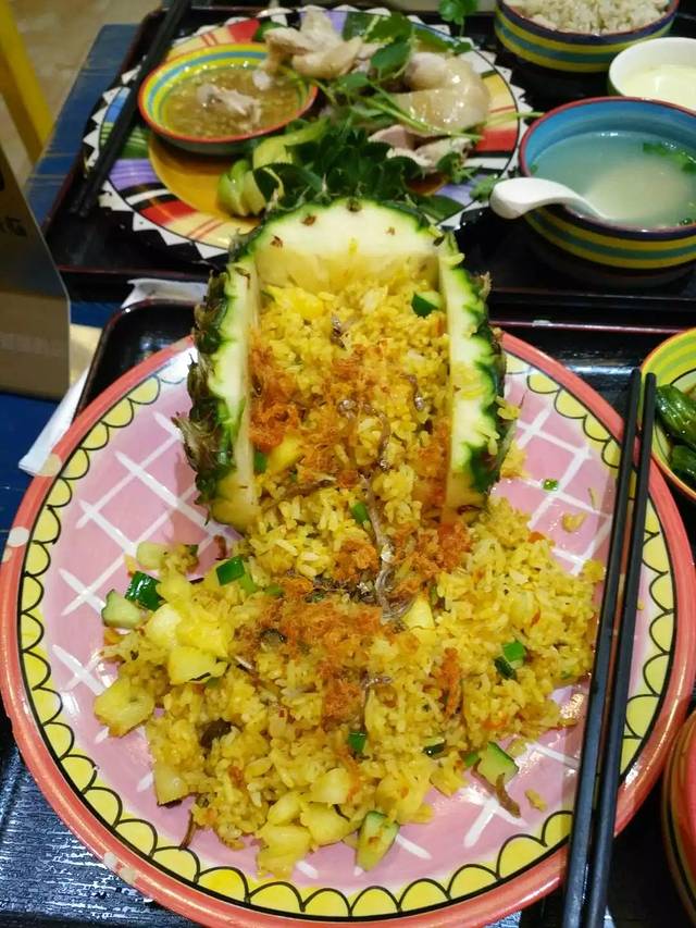 午都没吃饭,就等着晚上吃顿好的,看了好多攻略再加上在附近活动就选择了张猫猫的店,我点的菠萝饭和海南鸡饭,味道还不错海南的饭都很清淡对于北方的重口味的我们来说得加点咸菜,接着上图,他家的清补凉非常好喝。