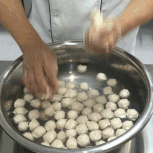 如果说将鱼肉打成泥需要的是耐心和大力,那么鱼丸的成型需要的则是技巧和熟练了。盛一勺鱼浆在手掌上摊开,中间放一块馅料,用手慢慢将鱼肉泥团拢起,在虎口处,轻轻挤出一个光滑完整的鱼丸,再用小匙舀起,再将鱼丸放入装水的盆里,这样鱼丸就不会互相黏在一起。