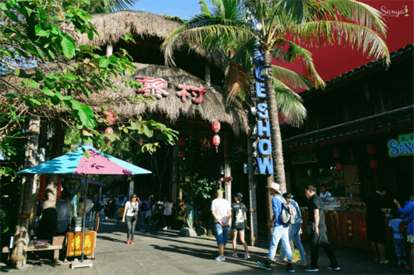 穿过爱情街就是黎村,这是在原始黎村的基础上修复而成,上千件古旧黎族生产生活器具陈列于此。下午十分热闹,有戏水的人们、有黎族小伙的街头演唱,有高科技互动游乐馆、有程府绣楼,还有黄昏十分的各类街头show,像《抛彩球招婿》、《婚礼巡游》、《古今人物大穿越》啦,大概20种,穿越感很强。