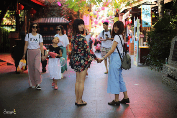 爱情街是最浪漫的地方了,整个风格被打造成为古代繁华盛世时的景象,两侧是海南传统黎族商品的店铺,可以体验手工陶器制作过程,看黎族老人编织黎锦,听一听民族的器乐,还有专门设置的复古邮局,给未来的自己写封信。