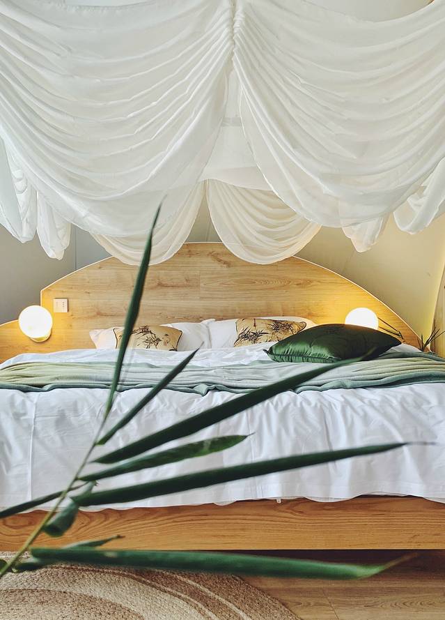房间的空间并不多,最主要的就是一张床,白色的温柔床幔,草绿的毯子,原木色小床头柜和浅色地毯,温馨舒适,配上门外的绿色,呼吸着新鲜空气,简直是健康生活的标配。独处时开一盏温暖的灯,坐在床边,读一本喜欢的书,听听音乐,等困意来袭,就可以顺利入睡。