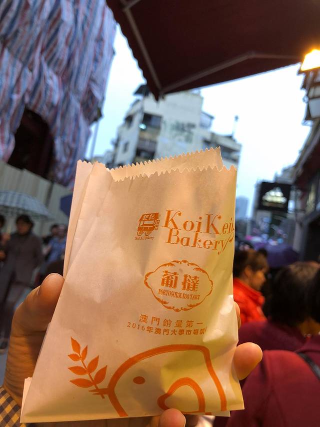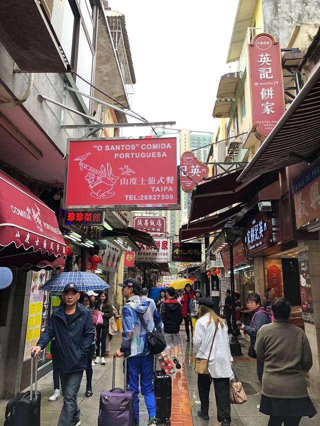 下雨天的人都这么多,可见要是不下雨人会更多,去往大三巴牌坊的路上,两面全是各种店铺,各种手信店,比较著名的就是卖饼的,但是我本人不是特别喜欢,去厦门的时候也是这些东西,所以就没有买,买了两个蛋挞尝了尝,味道还不错