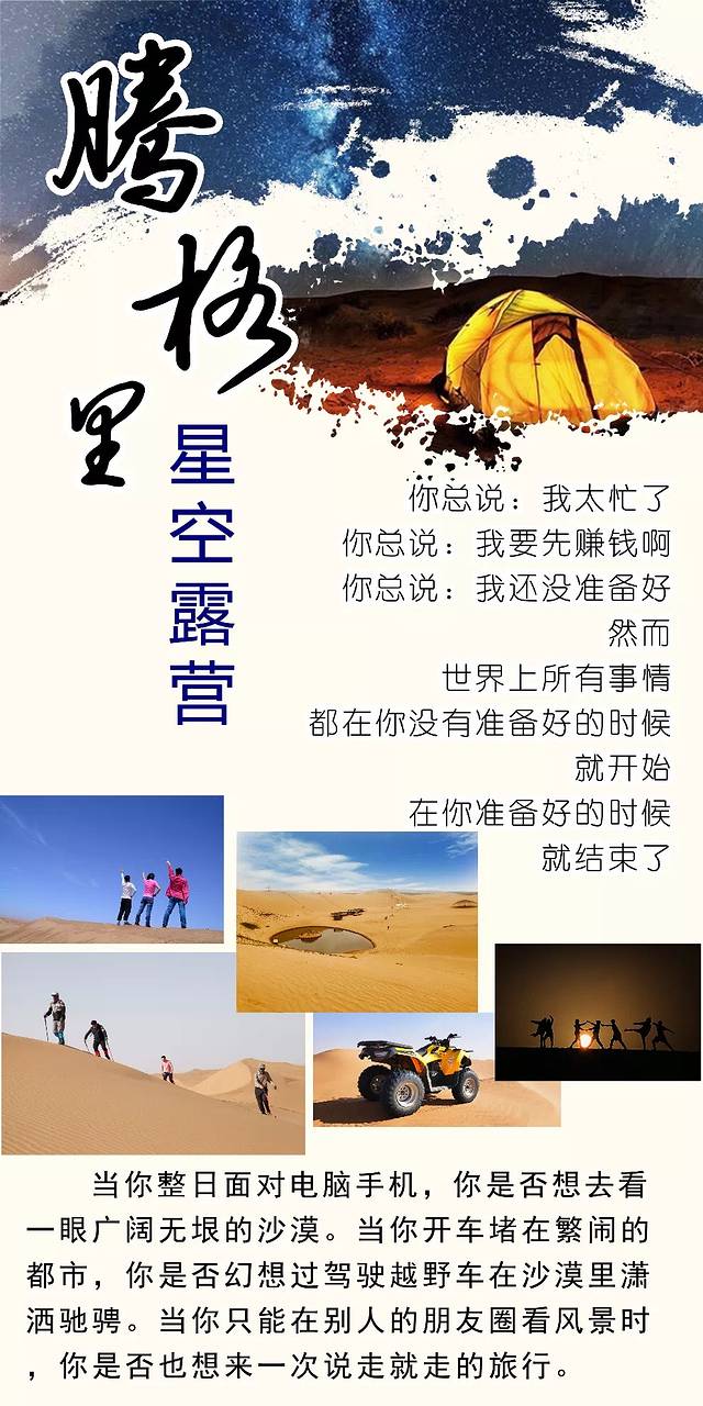 当你整日面对电脑手机,你是否想去看一眼广阔无垠的沙漠。当你开车堵在繁闹的都市,你是否幻想过驾驶越野车在沙漠里潇洒驰聘。当你只能在别人的朋友圈看风景时,你是否也想来一次说走就走的旅行。