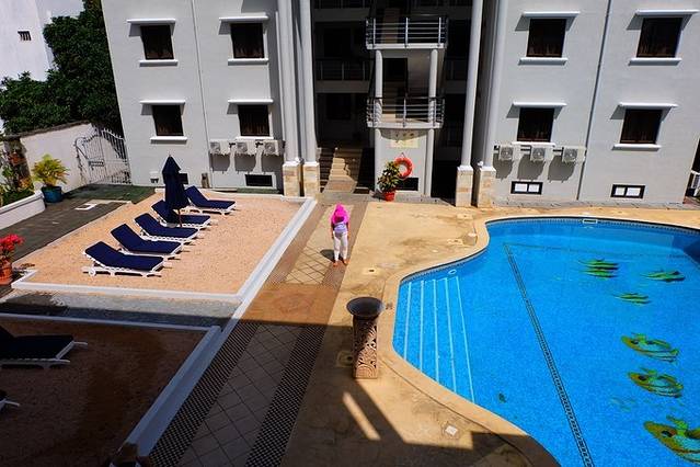 第二天一早起来,在阳台上拍下来的酒店照片。泳池很大,而且还没人。