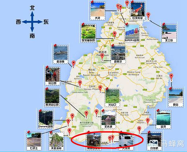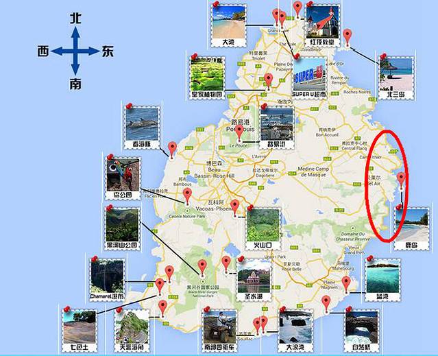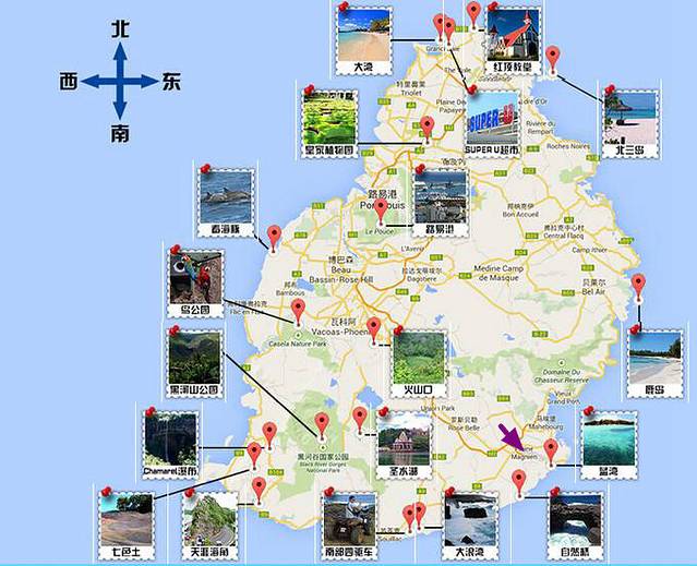 这张图基本上是 毛里求斯 所有热门景点了,右下角的紫色箭头处就是机场所在地。