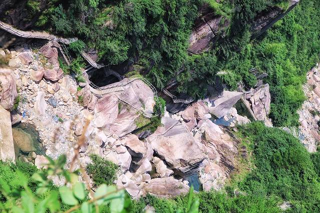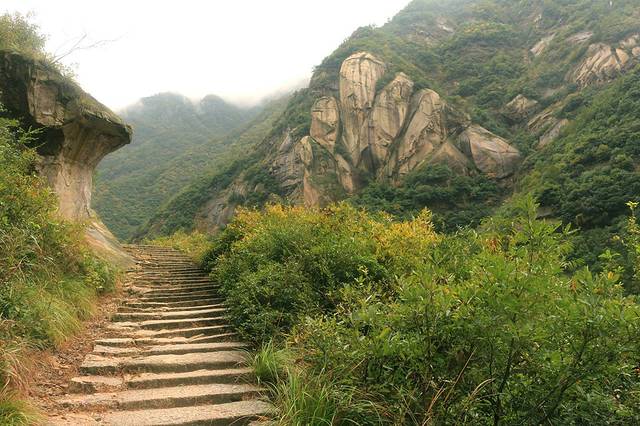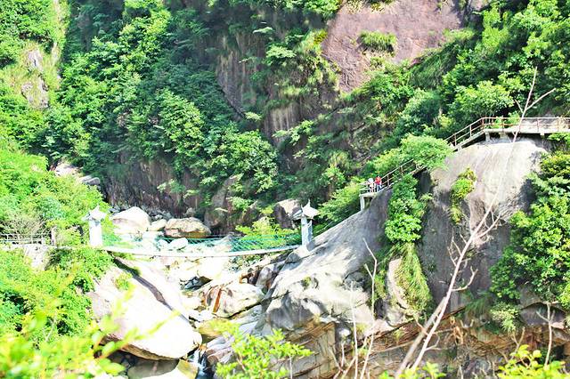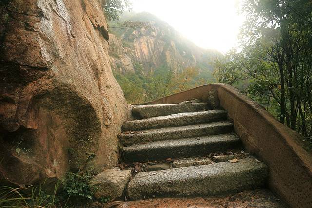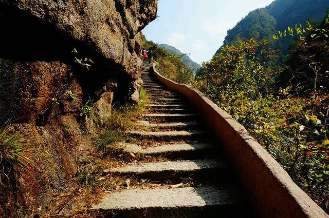 出亭后拾级而上,高峰巨岩,南北夹峙,怪石嶙峋,峭壁峻立;北岩的石壁之中,用人工凿开横档,嵌入长约2米的花岗石板,筑成栈道。石栈宛若天梯,向上伸展,直插白云深处。天梯顶端,一孔云天,即为江南第一关隘口。