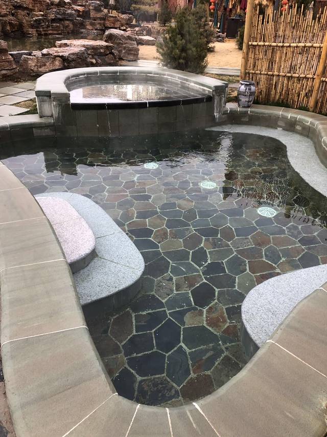 终于,下午三点多,我们开始泡温泉,每一个温泉池边都有显示温度,非常贴心,一般40度左右,非常舒服,我们怕万一冷,没有尝试室外的温泉,就在室内泡的温泉,不过已经非常满足了,恒温的舒适。因为还没减肥成功,我俩就不曝泳装照啦~