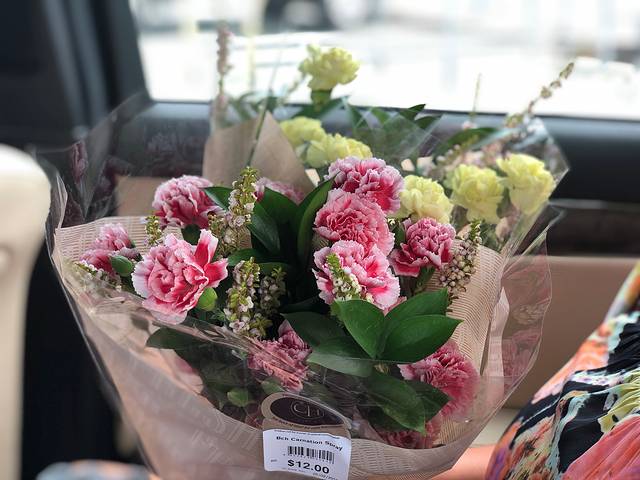 姐姐说做了一大桌菜,我们去超市买了一束花带去姐姐家