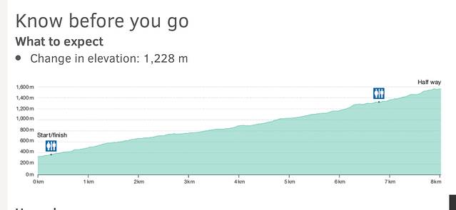 可以看图,这个就相当于爬山,坡度有点陡,有的地方有捷径,更陡。上去8公里,下来也8公里,但是我上山用了差不多3个半小时(可能还多,因为有和一小朋友一起)下山轻松点,但因为膝盖很酸,脚趾很痛 感觉也有三个小时。我们只爬到了网红拍照地,也是茅厕那儿,其实还可以再往上走,20分钟吧。