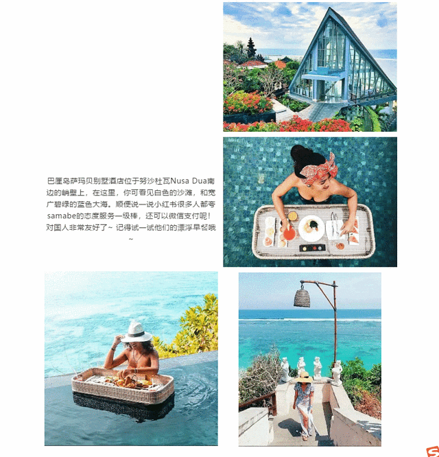 巴厘岛萨玛贝别墅酒店位于努沙杜瓦Nusa Dua南边的峭壁上,在这里,你可看见白色的沙滩,和宽广碧绿的蓝色大海。顺便说一说小红书很多人都夸samabe的态度服务一级棒,还可以微信支付呢!对国人非常友好了~ 记得试一试他们的漂浮早餐哦~