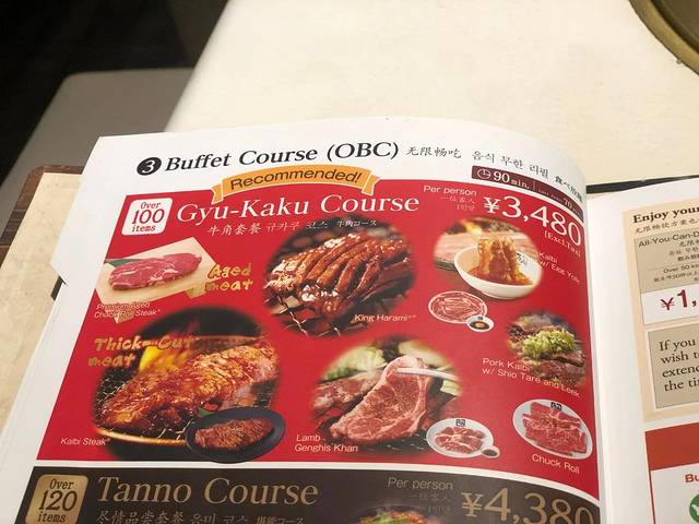 Gyukaku的用餐方式和国内的烤肉店有点不一样,菜单上有单点的菜品也有自助的部分,我们自然是选了一个自助的牛角套餐,套餐内的肉都可以无限畅吃,作为刚到 东京 的第一顿正餐,多少要一些仪式感。