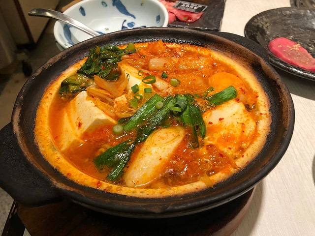 没下功夫肉就都吃完了,我们果断追加了一份大份的黑毛和牛套餐,配上一锅韩式豆腐汤。生肉上的酱只需沾一点就够,多了就咸,也怕盖了肉本身的味道。肋排肉和牛肩肉都是肥瘦相间,真的可以用漂亮两个字来形容,借着白芝麻的香味,嚼几口就好下咽。