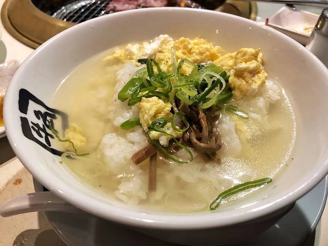 主食是一份清淡的汤泡饭,正好中和一下烤肉略微的油腻感,简单的咸鲜风味,最后竟也喝到汤都不剩。一定要推荐的小菜是那道温泉蛋豆腐,其实算一道冷菜,新鲜的嫩豆腐十分顺滑细腻,伴着一点甜辣酱一起入口,在吃过几盘烤肉快饱腹的时候还有的惊喜味道。