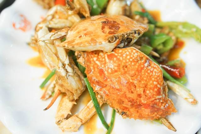 螃蟹很大一只,端上来的时候螃蟹已经切开来了,看着那橙黄的花蟹壳,闻着那飘香的味道,都快要流口水了。吃蟹很考验技巧,只能慢,不能快。轻轻地把外壳咬开,食取肉质精髓。香咸辣的蟹肉口感,很是鲜美。蟹壳里面还有满满的蟹膏,浓郁的蟹膏在嘴里化开,有点像咸鸭蛋黄的口感。