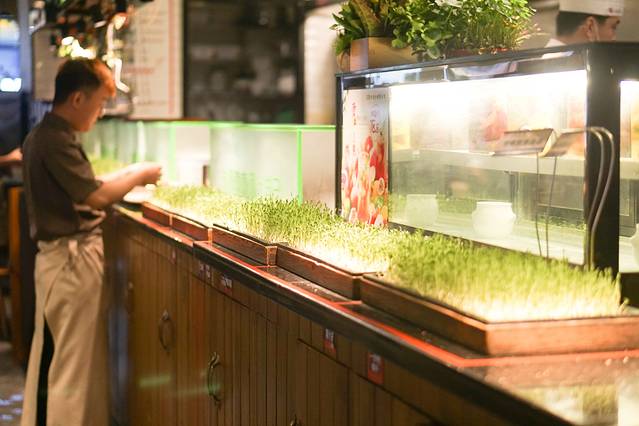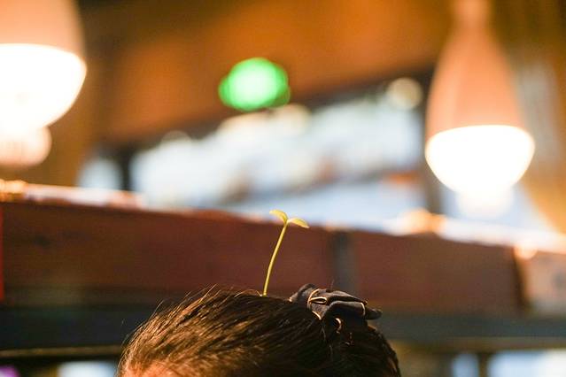 豆腐来自大豆,而大豆源于豆苗。进店以后,细心的我发现,每个服务员的头上都会顶着一颗小豆苗,可以说是店里的象征植物了,真有意思。