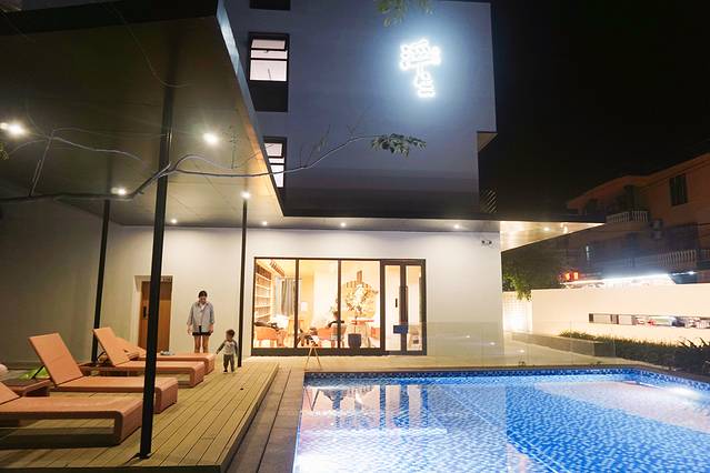 穿过玻璃门,室外是一个游泳池,虽然不大,但是水质清透,白天可以游泳,晚上可以静静地躺在椅子上抬头数星星。很是浪漫~