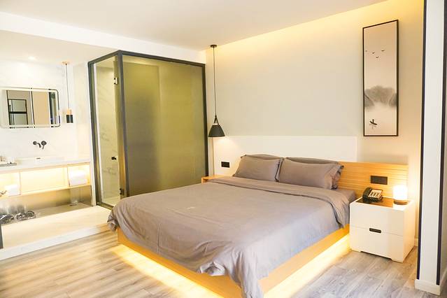房间很大,是淡蓝色的简约风格。我突然灵机一动,披上浴袍后就忍不住拍照了。有的时候静静地在房间里拍上一组照片也是不错的选择呢。