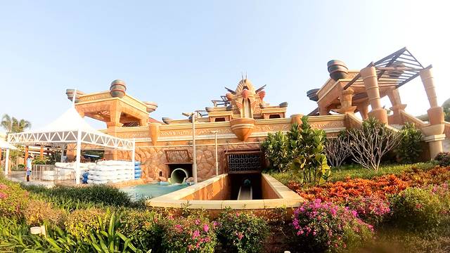 之后又去玩水上过山车,三个人很适合玩这个项目,刺激程度中等。三人皮筏,按体重来乘坐,轻的坐最前面。那我就是坐在最前面的那个人了。坐在皮筏上,随着动力平缓而上,突然立马滑入管道,进去管道时忽暗忽明,我完全迷失了方向感,突然水流的倾下,感觉冰凉又刺激。玩了一遍不过瘾,再多玩一次。