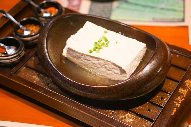 半豆外形的碟子里装着一大块豆腐,撒上葱花,架上3道味碟。调料分别是辣椒酱、酱油、自家秘制酱料。先是不添加任何调料,原汁原味地品上一口。豆腐入嘴,很是嫩滑美味,还伴随着浓郁的豆香味儿,就算是吃到尾端,淡淡的豆子香也会在你的口腔里存留。